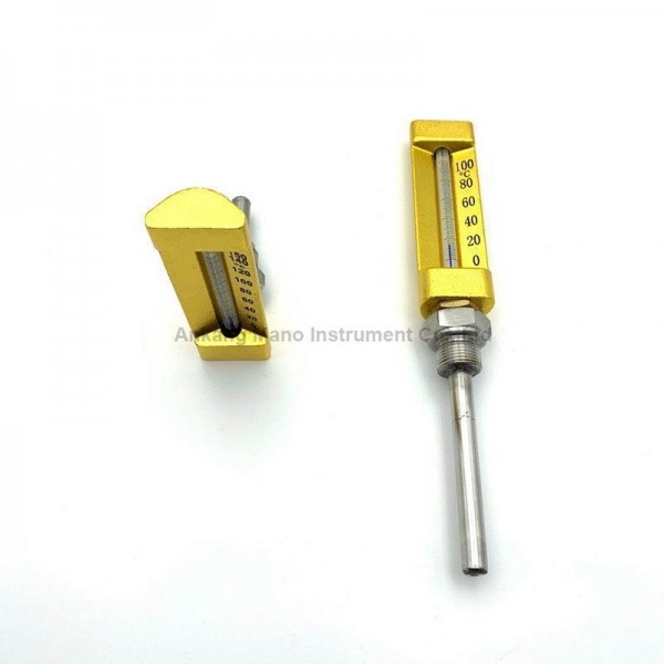 Case Aluminum, brass-colored, anodized Stem Material Stainless steel Thread size Male thread M18x1,5male thread G1/2 (other thread is allowed) Measuring principle Liquid expansion Mounting type 90° angle version design, back mounting; Straight design, lower mounting; |